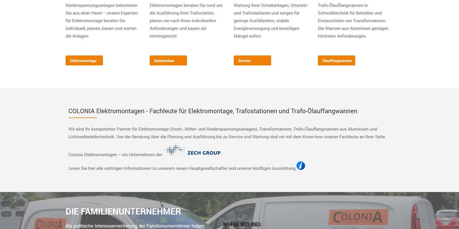 Das Unternehmen Colonia Elektromontagen beauftragte neben einer neuen Website auch Imagebroschüren und Visitenkarten. Das Layout spiegelt den technischen Charakter des Unternehmens wieder. Zusätzlich wurde ein Konfigurator zur Anfrage von Ölauffangwannen bestellt. Realisiert wurde die Website mittels Content Management System zur einfachen Pflege der Inhalte durch das Unternehmen Colonia Elektromontagen.
